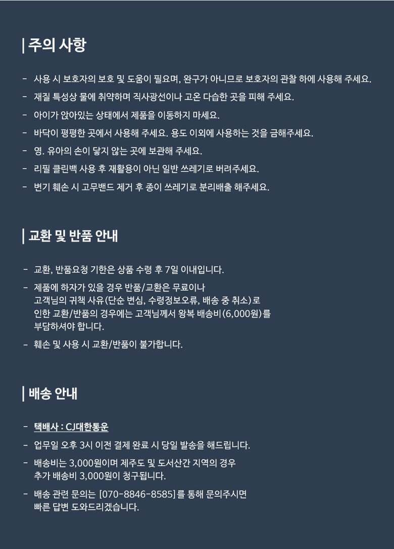 - 고객 변심으로 인한 교환/반품은 상품 수령 후 14일 이내 가능합니다.